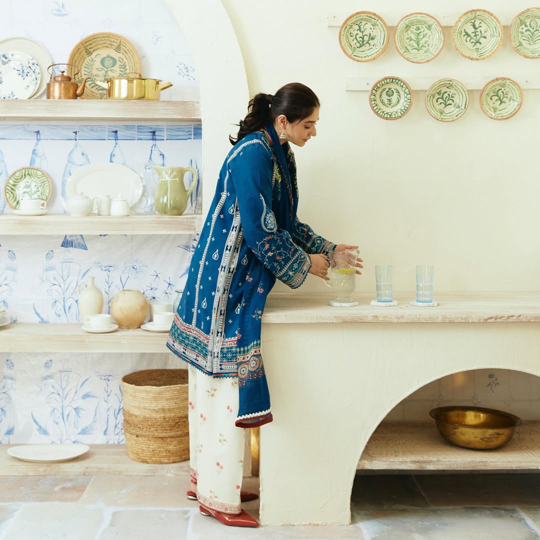 This elegant 3-piece festive outfit is crafted in rich teal linen, featuring a straight-cut slim-fit kurta adorned with fine embroidered detailing. It is paired with a classic farshi shalwar and a lightweight chiffon dupatta, making it an ideal choice for festive gatherings and party wear. A timeless ensemble designed for graceful elegance in every season.